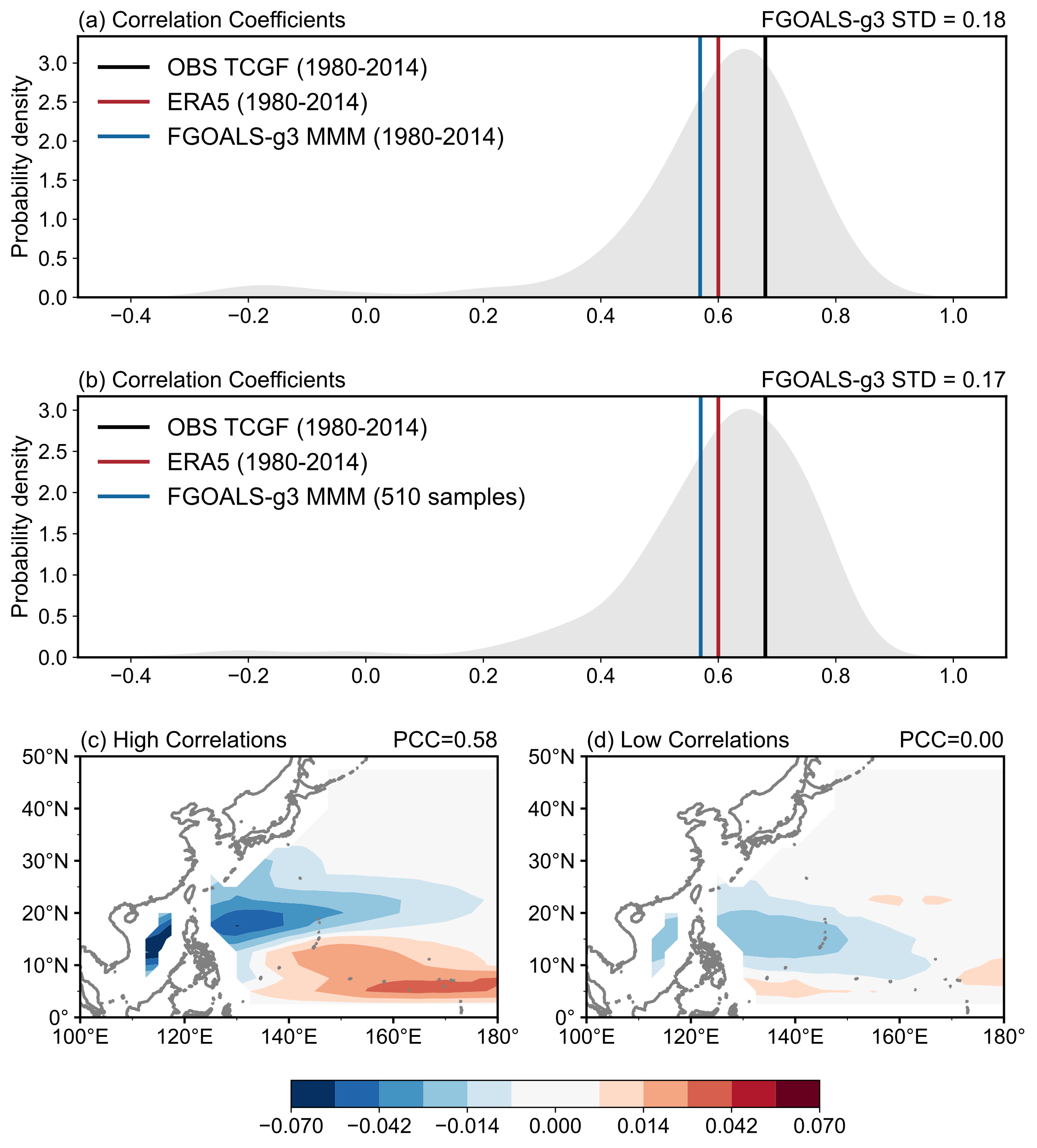 图2 (a) 区域平均的TCGF/EGPI与Niño 3.4指数之间的相关系数,分别来源于观测(黑线)、ERA5(红线)和FGOALS-g3大集合(灰色阴影表示概率分布,蓝线表示集合均值)。观测、ERA5和模型模拟的数据覆盖1980年至2014年期间。(b) 与(a)相同,但模型模拟使用了510个样本(1850-1879、1880-1909、1910-1939、1940-1969、1970-1999)。(c-d) JAS Niño 3.4指数回归到相关系数最高的集合成员(高于95百分位数;c)平均和相关系数最低的集合成员(低于5百分位数;d)平均的EGPI。单位:1 K⁻¹。右上角的数字为与观测模式的模式相关系数。