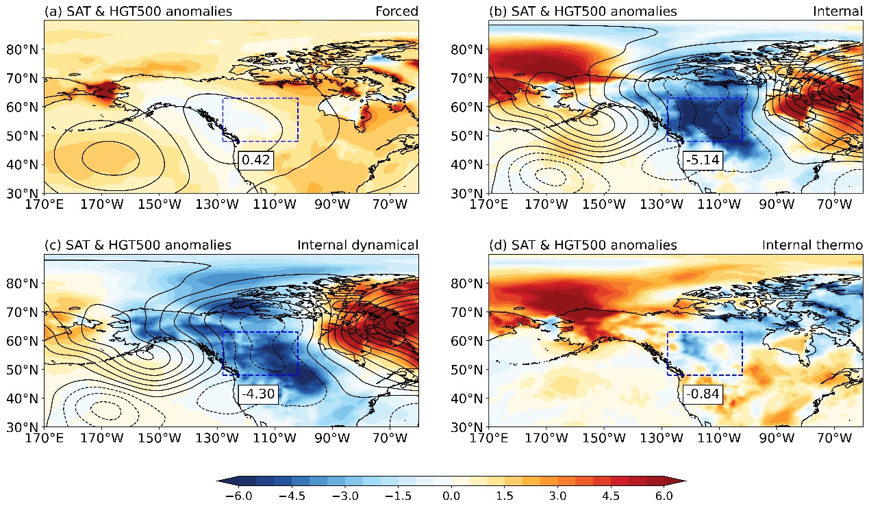 图1. 2022年12月SAT(填色;K)和HGT500(等值线;20gpm)异常:(a)外部强迫部分;(b)内部变率部分;(c)内部动力部分;(d)内部热力部分。图中的蓝框表示北美地区,蓝框下面的数字代表北美地区区域平均的SAT异常。