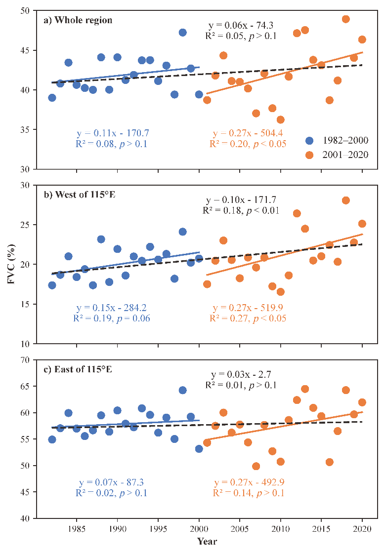 图1 1982-2020年内蒙古草地植被覆盖度 (FVC) 随时间的变化。(a) 整个研究区,(b) 东经115度以西, (c) 东经115度以东。