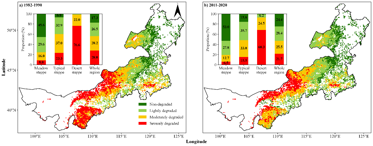 为了定量评估研究区草地退化状况及其动态变化,研究人员利用1982年至2020年的长时间序列遥感数据(GIMMS NDVI和MODIS NDVI)在高空间分辨率水平上分别计算了植被覆盖度(Fractional Vegetation Cover,FVC)和草地退化指数(Grassland Degradation Index,GDI)。结果表明,在研究时段内,研究区平均FVC为42%,其中退化草地(GDI<0.9)约占研究区总面积的85%。空间上,FVC和GDI均呈现出显著的空间异质性。东经115°以西区域平均FVC约为21%,其中近98%的区域处于退化状态;而东经115°以东区域平均FVC约为58%,有约68%的区域处于退化状态。时间上,退化草地比例整体呈下降趋势,尤其在最近20年里(2001-2020)。值得注意的是,在最近的十年里(2011-2020),全区仍有约3/4的草地处于退化状态。因此,尽管一系列生态保护措施在一定程度上减缓了研究区草地退化的态势,并在部分地区促进了退化草地的恢复,但全区草地退化问题依然严峻,尤其是在东经115°以西地区,该区域约80%的草地处于中度和重度退化状态(GDI< 0.6)。