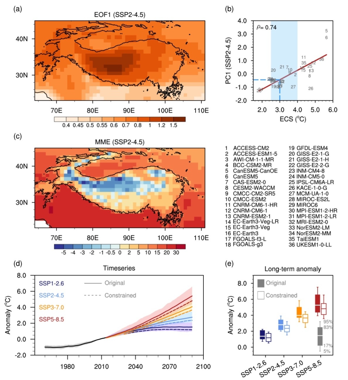 图1. (a-b)气候敏感度与亚洲高山区年平均地表气温升温幅度之间的关系;(c)SSP2-4.5情景下2081-2100年亚洲高山区年平均地表气温约束预估结果;(d-f)不同情景下亚洲高山区年平均地表气温约束前后对比。