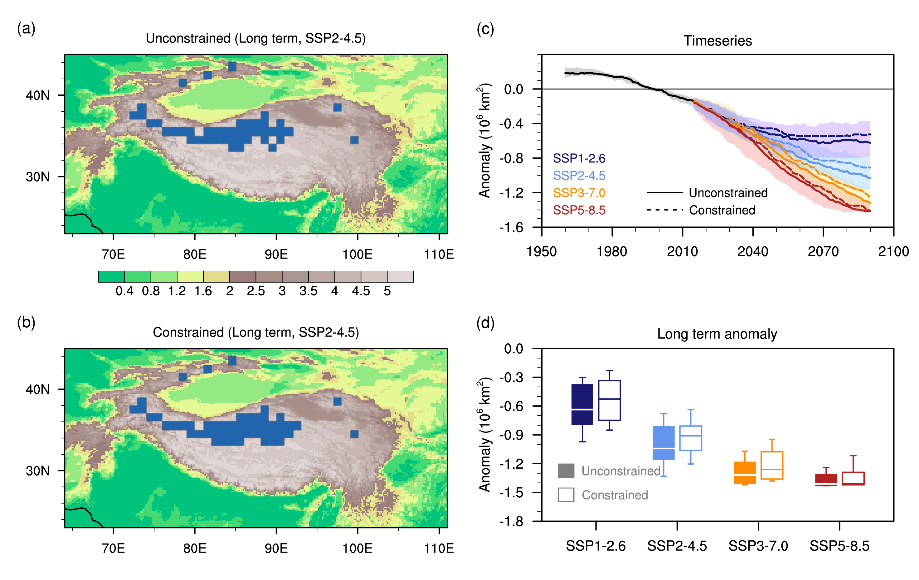 图2. (a-b)约束前后SSP2-4.5情景下2081-2100年基于概率模型得到的亚洲高山区多年冻土分布(蓝色为多年冻土区);(c-d)约束前后不同情景下亚洲高山区多年冻土面积相对当前(2000-2016年)减少量。