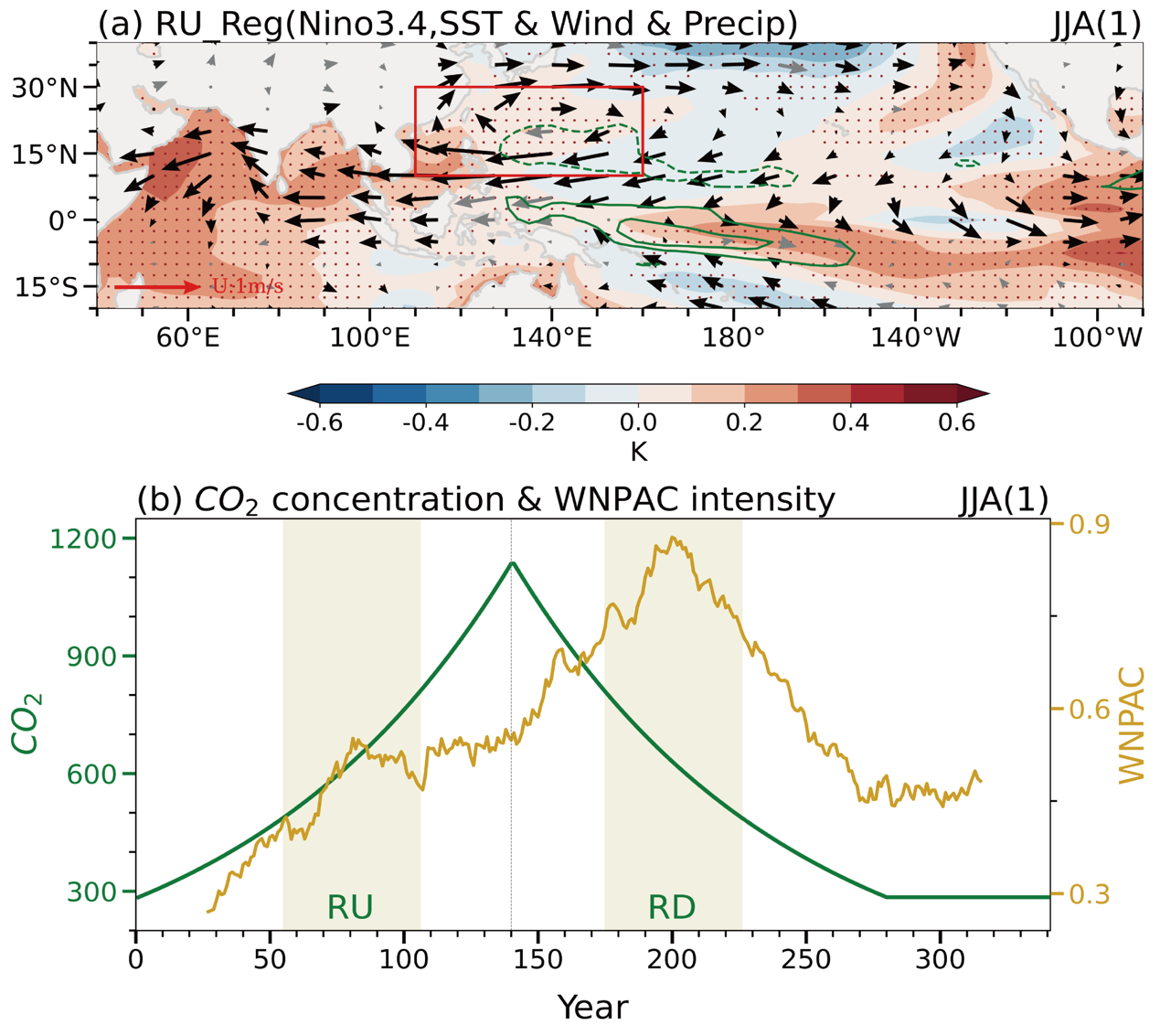 图1. WNPAC强度的非对称响应。(a) 在CO2浓度上升期,标准化的Niño-3.4指数回归的SST异常、降水异常和850-hPa风异常,红色实线矩形框突出显示了WNP区域。(b) CO2浓度和WNPAC强度的演变。