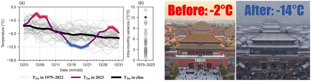 图1 1979至2023年12月份中国区域的(a)地表气温演变及(b)月内方差; 天气鞭打事件示意图(由薛紫玥与资鹏拍摄)。