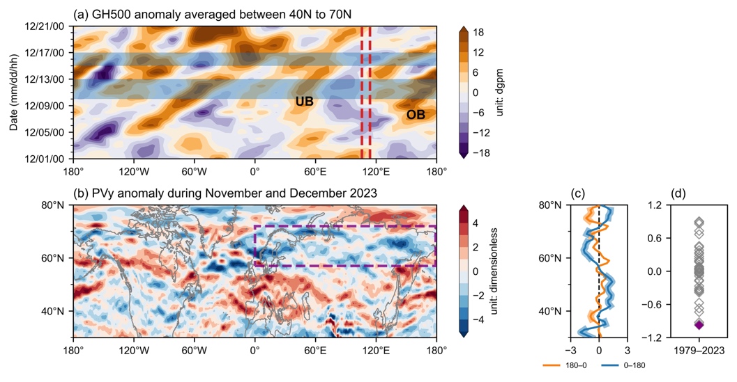 图2(a)40–70N平均位势高度的时间演变即Hovmöller图;2023年11月和12月平均的经向位涡梯度的(b)水平分布、(c)东半球与西半球的纬向平均分布以及(d)东半球中高纬度的平均情况。