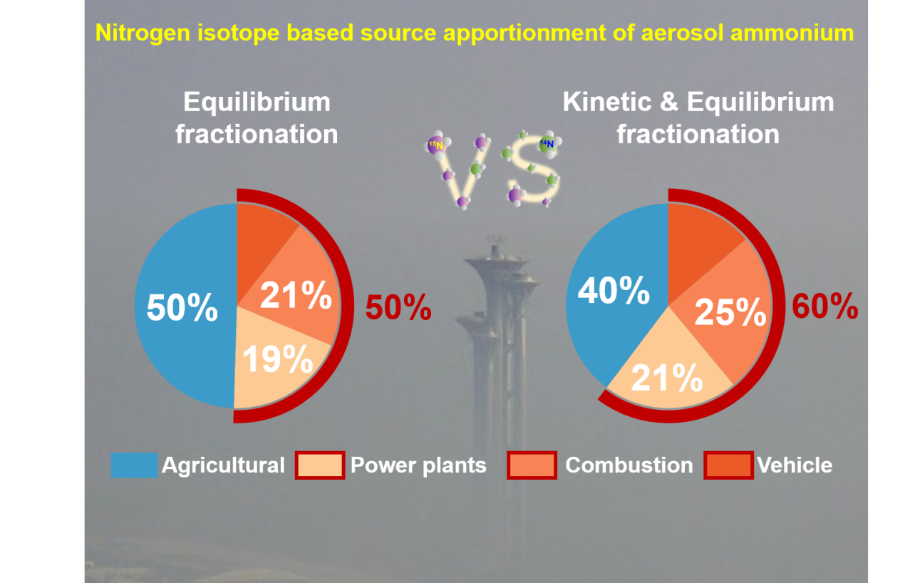 图1:北京冬季气溶胶铵盐的来源构成(左侧情景仅考虑大气氨在气粒转化过程中的氮同位素平衡分馏过程,右侧同时考虑平衡分馏和动力学分馏)