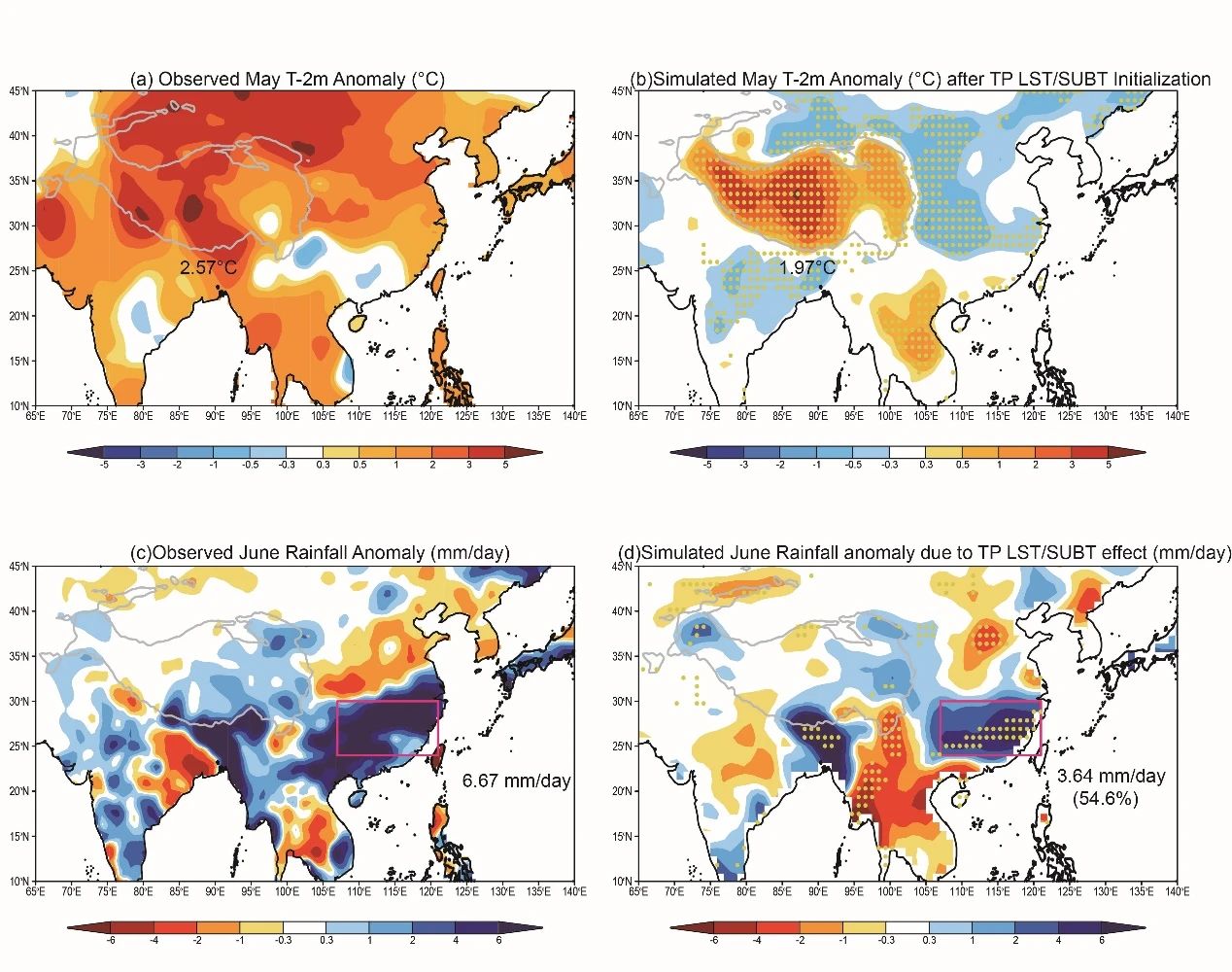 2024年6月,中国南方遭遇了持续强降雨,造成严重社会经济影响,受到广泛关注。全球能量和水循环(GEWEX) 组织的“初始化地表温度及积雪对次季节-季节预测的影响(LS4P)”国际项目的研究初步发现,春季青藏高原地面温度偏高/低时,中国南方夏季很可能遭遇洪涝/干旱。受此启发,研究人员分析了青藏高原春季的地面温度,发现2024年5月高原地面温度创下自1980年以来最热的春季纪录。因此,2024年青藏高原春季异常偏暖很有可能导致南方强降雨。