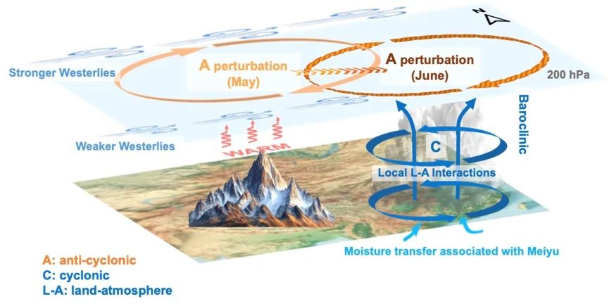 综上所述,2024年青藏高原异常暖春是6月中国南方持续强降雨的主要成因(图2)。此项成果以中国科学院大气物理研究所李倩副研究员为第一作者,加州大学洛杉矶分校Xue Yongkang教授为通讯作者在《Science Bulletin》上发表。