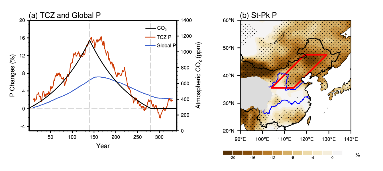东亚气候过渡带是季风主导的湿润区向西风带主导的干旱区的过渡区域,水资源匮乏,对气候变化十分敏感。随着《巴黎协定》1.5℃ 和 2℃ 温升目标的推进,亟需通过二氧化碳移除(CDR)技术降低大气CO2浓度。然而,其引起的气候变化如何影响这一敏感区域,尚缺乏充分的科学认知。