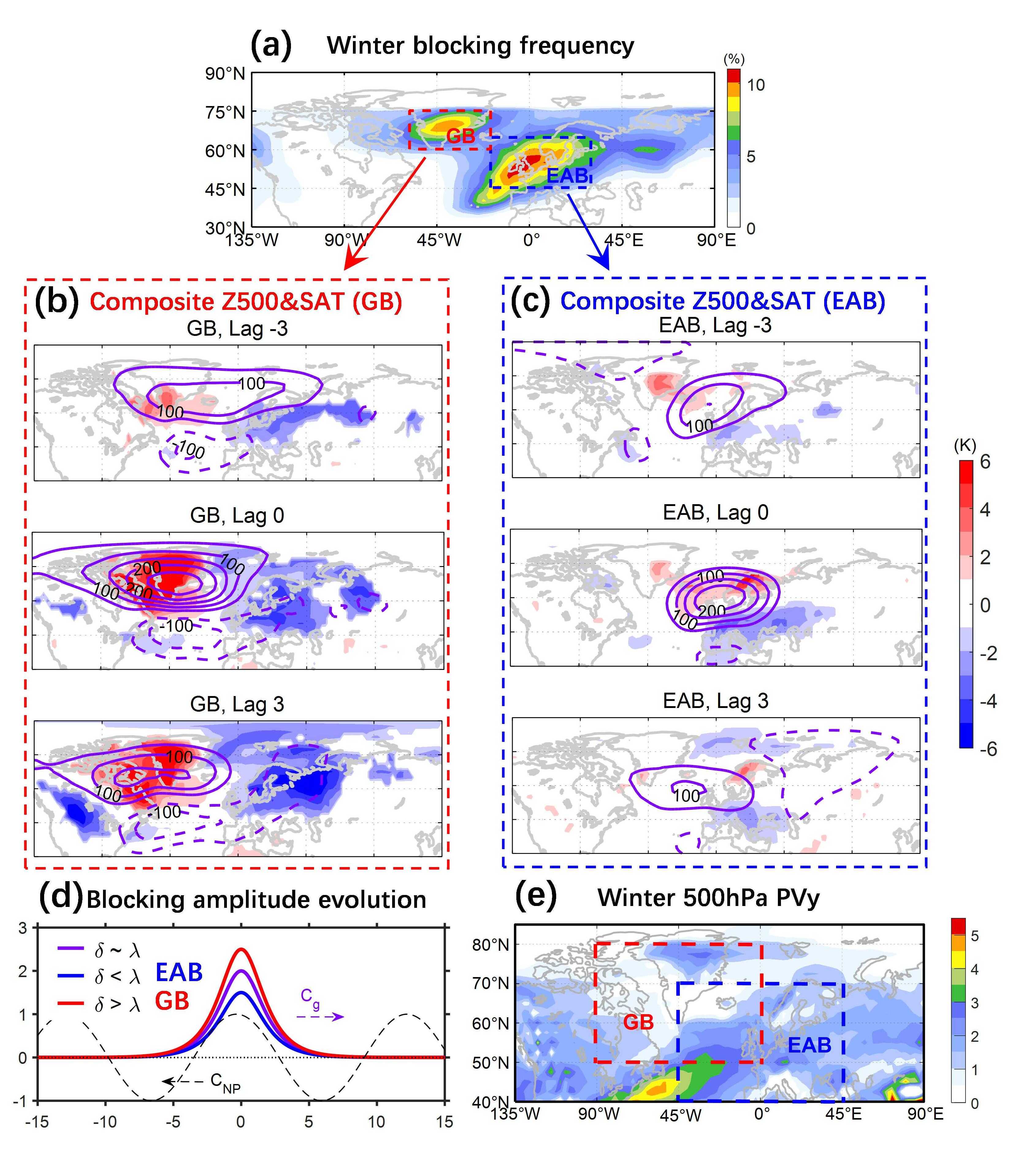图1.(a)冬季平均阻塞频率(%);合成的(b)格陵兰阻塞(GB)和(c)欧亚-大西洋阻塞(EAB)事件期间500 hPa位势高度(等值线)与地表气温(填色)距平场的时间演变;(d)非线性与色散效应调控下阻塞振幅演变的示意图;(e)500 hPa冬季PVy的水平分布。