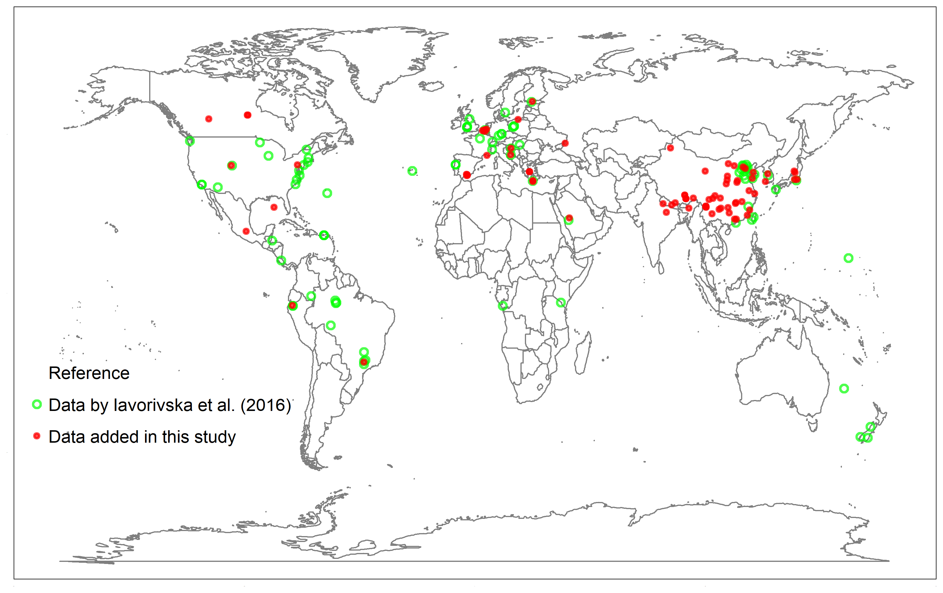 全球尺度上,有机碳大气沉降通量与河流入海通量相当,凸显了大气沉降在全球碳循环研究中的重要性。但是,以往两篇经典文献估算的全球大气有机碳沉降量相差近2倍,分别是389 Tg C yr-1n=9Wielly et al., GBC, 2000)和658 Tg C yr-1n=81; Iavorivska et al., AE, 2016)。原因在于,他们使用的基础数据在全球覆盖度上有所欠缺,特别是缺少中国等排放量较大的亚洲区站点(图1),导致他们估算的全球大气有机碳沉降量存在较大不确定性。