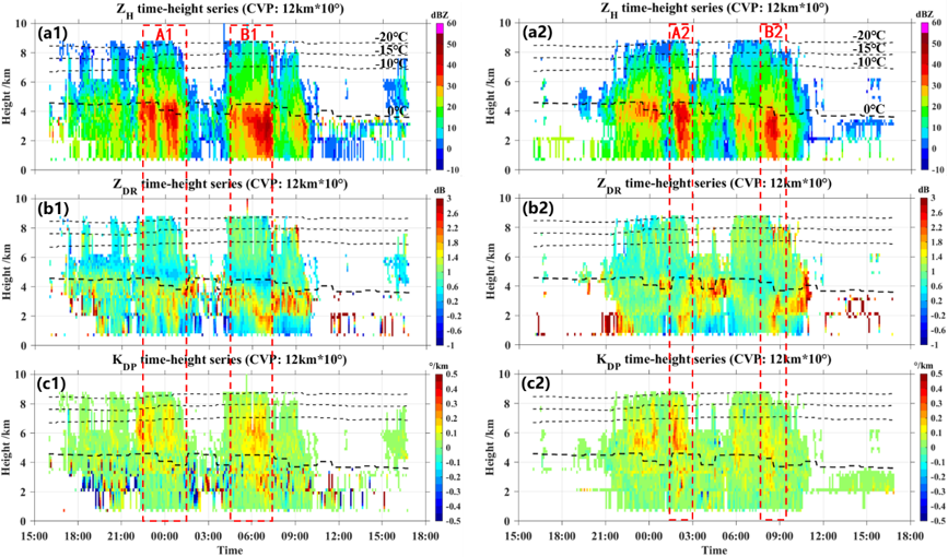 图1 云系先后移过两个目标区域时的 (a1, a2) ZH, (b1, b2) ZDR, (c1, c2) KDP的CVPs(红色虚线框:云系两个阶段中的较强回波时段)。
