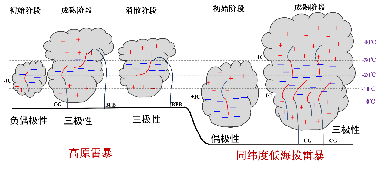 在一定的动力和微物理条件下,雷雨云中冰-水共存的混合相态区域内,不同大小的冰相水凝物粒子(主要是霰粒和冰晶)之间弹性碰撞后发生电荷转移,在气流和重力作用下,携带不同极性电荷的大、小冰相粒子宏观分离,在雷雨云中呈现出正、负电荷在不同区域聚集的状态,是闪电发生的前提。团队研发了基于闪电通道发展物理性质差异解析雷雨云电荷分布的方法,基于此揭示了产生晴天霹雳的高原雷雨云电荷结构的演变特征,初始发展阶段首先在云中形成“上负-下正”的负偶极电荷结构,成熟阶段进一步发展出上部正电荷区,演变为“正-负-正”三极子电荷结构。晴天霹雳放电从云上部正偶极子的正、负电荷区之间始发,并以双向先导的形式分别向相反极性的电荷区域发展,负极性通道向上“突围”,击穿云上部正电荷层后,闪电通道水平“拐弯”冲出云体,在晴空中潜行数公里后转向并直击地面。