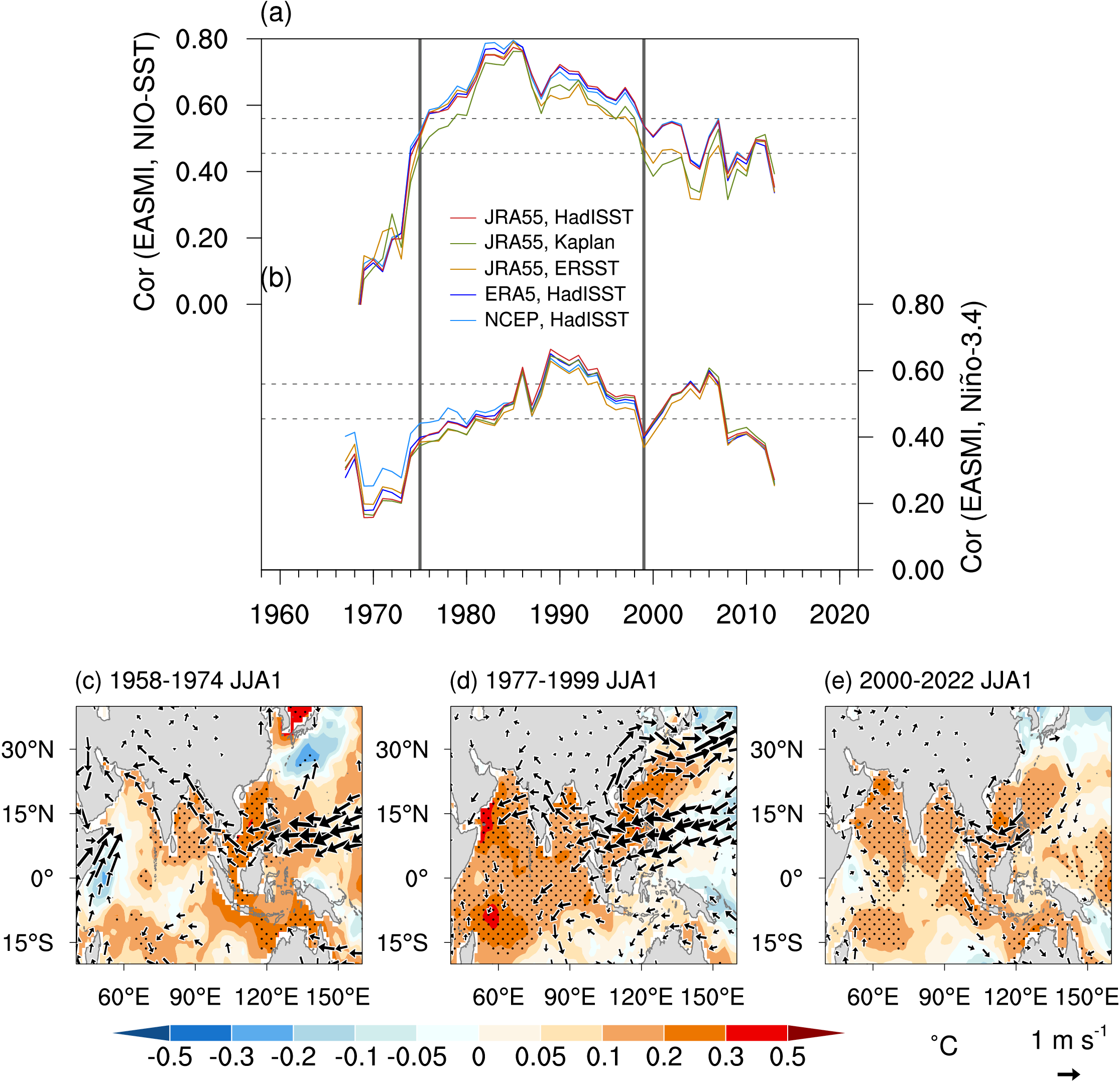 图1 ENSO对东亚夏季风影响的年代际变化。(a,b)东亚夏季风指数与夏季北印度洋海温和前冬Nino3.4指数的19年滑动相关,(c-e)前冬Nino3.4指数回归的海温和850hPa风场。
