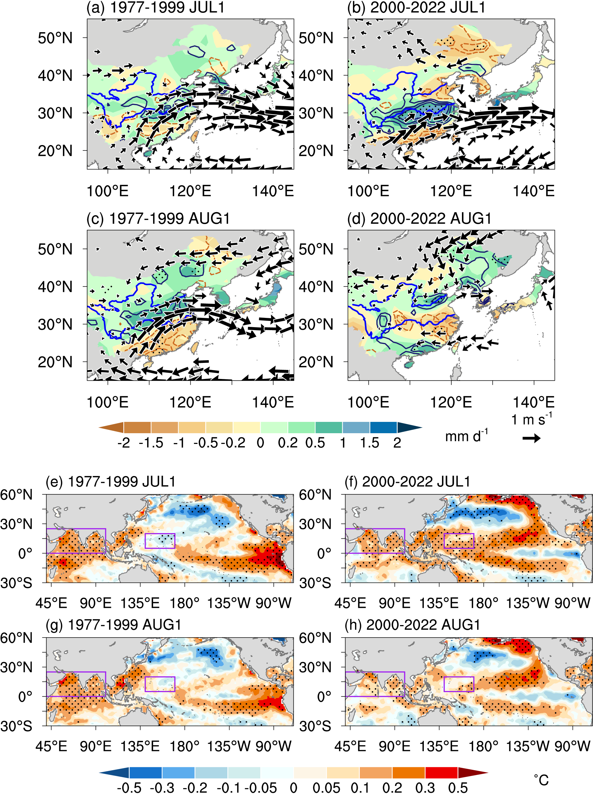 气候变化背景下,ENSO性质在2000年前后又经历了一次明显的年代际转变,其主周期明显缩短向准两年移动,振幅减弱,中太平洋型ENSO发生的频率明显升高。近日,中国科学院大气物理研究所于甜甜副研究员等在npj Climate and Atmospheric Science上发表的研究表明,热带海气耦合对ENSO的响应在2000年前后出现新的转折点,特别是在西北太平洋地区显著减弱,热带关键区海气耦合的调整进一步导致了东亚夏季风的变化(图1)。与El Niño相关的西北太平洋环流异常在8月快速衰退,由西北太平洋反气旋转变为西北太平洋气旋,这对东亚地区的降水有着重要影响(图2)。进一步研究表明,2000年前后ENSO衰退加快,导致印度洋海气正反馈减弱和西北太平洋变暖,相应的东风响应减弱进一步导致北印度洋夏季的增温峰值较弱并迅速衰减,从而无法维持8月的西北太平洋反气旋。
