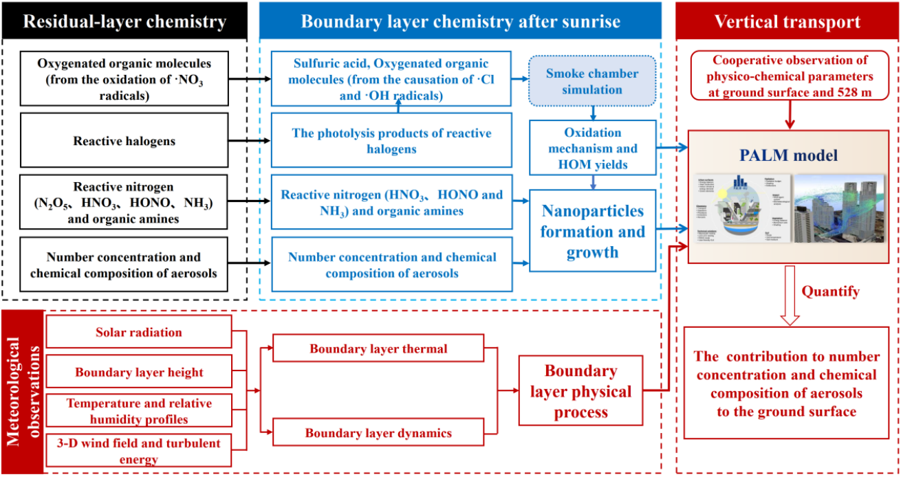 残留层作为夜间稳定边界层与自由大气间的物质能量交换通道,其物理化学过程对边界层内气溶胶与活性气体的垂直再分配产生重要影响。然而,由于残留层在对流层中特殊的位置以及快速演变的性质,对其物理化学过程的原位探测和对近地面空气质量影响的定量评估一直是大气科学领域最具挑战性的研究课题之一。