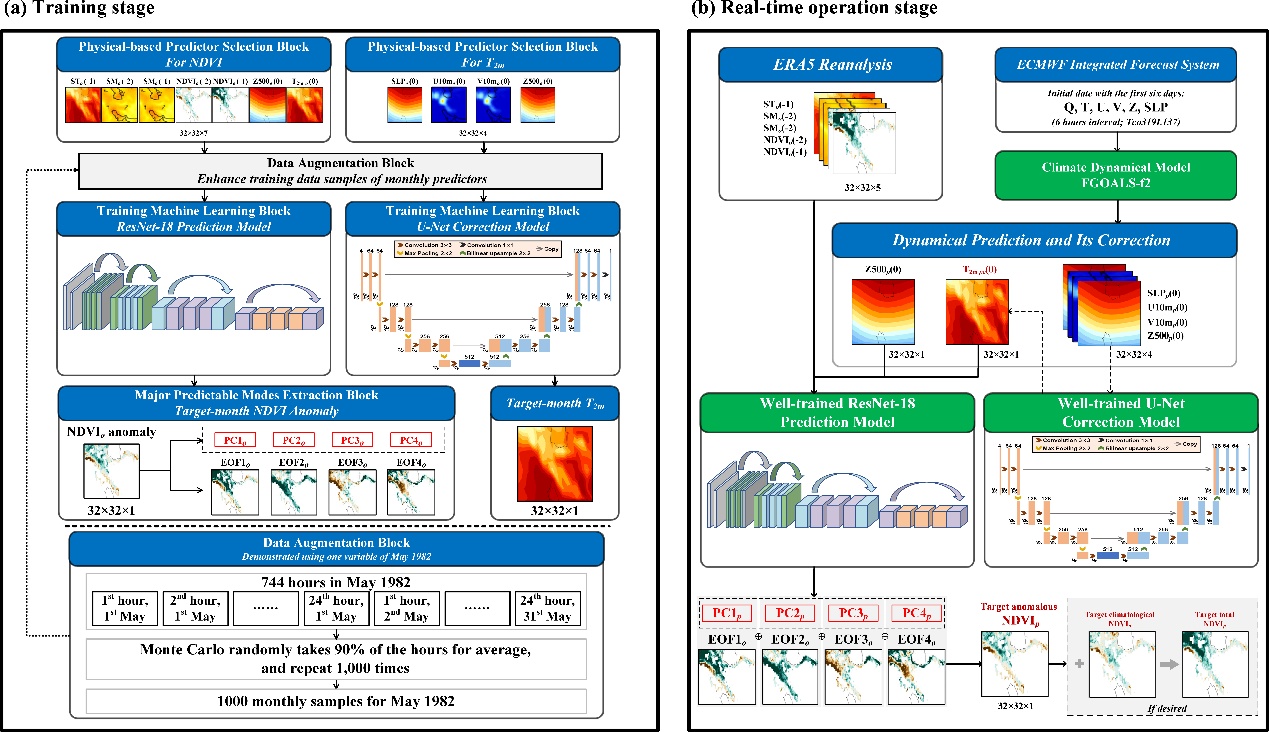 为应对这一挑战,中国科学院大气物理研究所联合北京师范大学、香港科技大学和英国气象局开展研究,创新性地构建了机器学习-气候动力混合次季节预测模型,实现了对作物健康关键指标NDVI(归一化植被指数)的提前1个月的精准预测。2025年5月,研究成果在农林气象领域顶刊《Agricultural and Forest Meteorology》上在线正式发表。