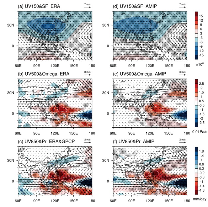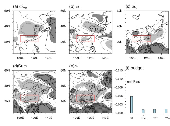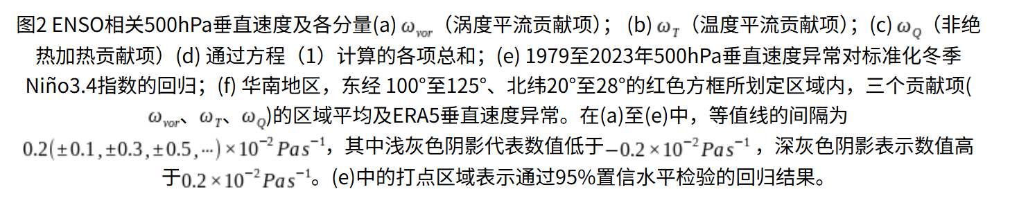 基于线性化ω方程分解,团队量化了垂直上升运动的三个贡献项(图2):涡度平流(20%)、温度平流(22%)和非绝热加热(24%),这三个过程在华南至日本以南区域形成上升运动走廊,与观测的正降水异常带高度重合。CMIP6 模型集合模拟结果验证了这一机制的可靠性。
