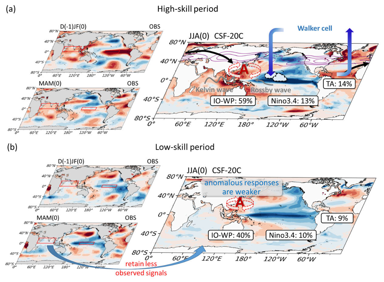 近期,中国科学院大气物理研究所地球系统数值模拟与应用全国重点实验室博士生叶万恒与胡帅副研究员等,在《Journal of Geophysical Research: Atmospheres》发表最新研究成果。该研究基于百年尺度季节回报试验数据集(CSF-20C)的分析发现,自1960年代以来,夏季西太副高的季节预测技巧呈现显著提升趋势,导致这一变化的关键海区为印度洋-西北太平洋。
