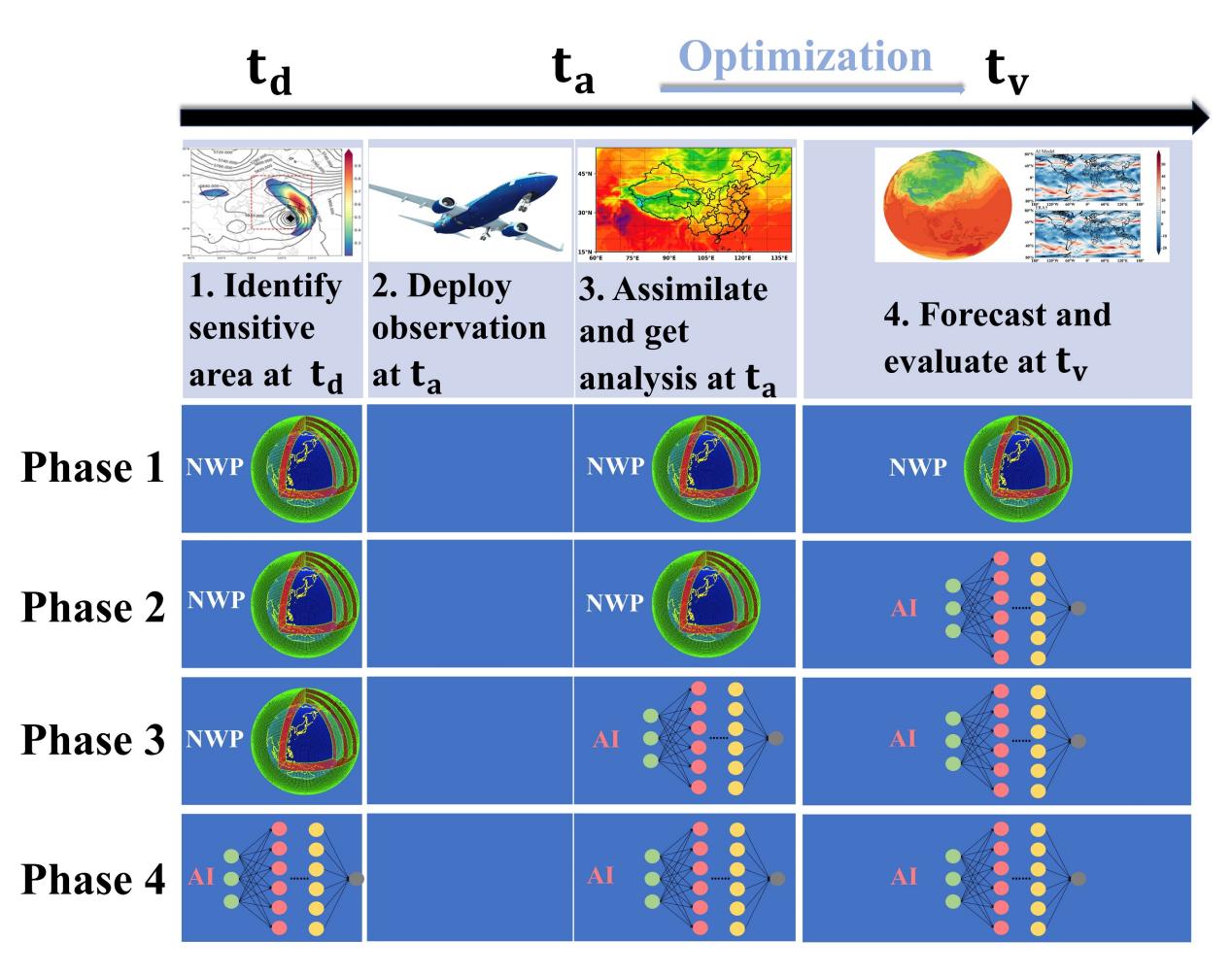 近年来,以复旦-伏羲、华为-盘古等为代表的人工智能(AI)气象模型快速发展,并对TC路径预报呈现了较传统数值模式更高的计算效率和预报精度,但海洋上大气观测的数量和质量很难得到保证,仍大大限制了AI模型关于TC路径预报的准确性。因此,若能将目标观测技术融入AI模型预报,必将缩短确定敏感区的时间,进而减小模型误差影响。那么,经济的目标观测策略能否在AI模型中进一步提升TC路径的预报水平呢?该问题的回答将对高效获取额外观测,提高台风业务预报水平具有重要意义。