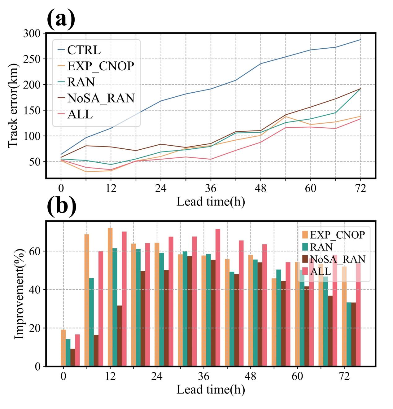 研究发现,无论是基于盘古模型驱动的孟加拉湾风暴预报,还是基于伏羲模型驱动的西北太平洋台风预报,它们用CNOP识别的目标观测敏感区均呈现一致的空间分布特征,即主要位于TC中心附近及其与副热带高压的交界处,反映了TC本身及其与环境场(如大尺度引导气流)共同作用对TC移动路径的重要影响(图2),符合TC路径移动的动力和物理机理。通过大量观测系统模拟试验,发现优先同化CNOP敏感区内额外观测,较同化其它随机区域观测,能够更加显著地提升TC路径预报技巧,但随着随机区域逐步靠近敏感区,TC路径预报技巧的改进效果也越明显。因此,用动力学方法CNOP有效识别了AI模型驱动的TC路径预报的目标观测敏感区,尤其发现,同化CNOP敏感区的少量观测,即可达到甚至超过同化大范围或全部观测的预报效果(图3)。所以,即使国际上大力推动AI技术融入业务预报,提高预报水平,但用CNOP动力学方法识别目标观测敏感区,获得额外观测,可进一步有效提高其预报水平。