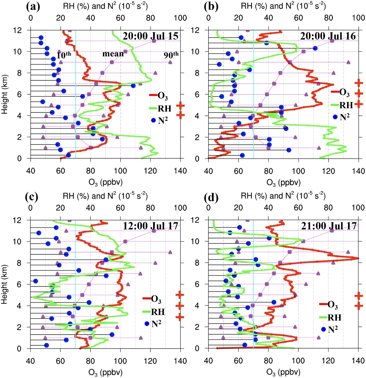 图为2024年7月15-17日引雷基地连续四次臭氧探空的观测结果,包括臭氧(红色线)、相对湿度RH(绿色线)和静力稳定度(蓝色点)。