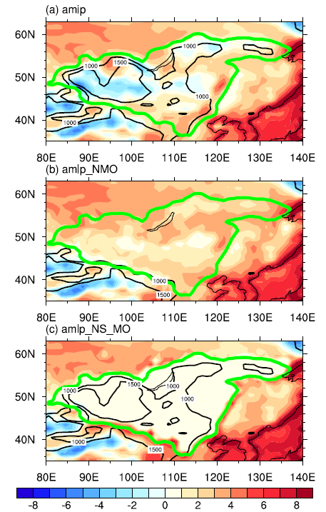 针对本研究进行的蒙古高原地形扰动试验,我们开展了三组大气模式比较计划(AMIP)类型试验。第一组试验(amip)为参考试验,其设置与CMIP6诊断、评估和模式特性试验(DECK)中的amip试验相同,积分时间从1976年开始,输出数据时间为1979年至2021年;第二组试验(amip-NMO)为地形扰动试验,即为移除蒙古高原及其周边500米以上高度的地形(如图1所示);第三组试验(amip-NS-MO)为热力扰动试验,即移除海拔高于500米的蒙古高原及周边区域的地表感热加热(如图2所示)。每个试验共输出了1979年至2021年期间的42个变量,包括月平均、日平均、6小时瞬时以及逐小时输出的降水、地面气温等气象数据。所有模式输出的数据水平分辨率均被插值至1°×1°水平,垂直方向上,模式采用混合坐标,共分32层,模式顶气压为2.16 hPa。图3,4分别给出了地形热力动力试验中模式模拟的气候态气温和降水的响应。结果表明,模式参考试验能够较好的模拟出观测的相关空间分布,其对地形扰动的响应从理论上来说也是较为合理的,表明了数据集具有较好的可靠性,为进一步深入研究蒙古高原地形天气气候效应提供了重要的科学数据。