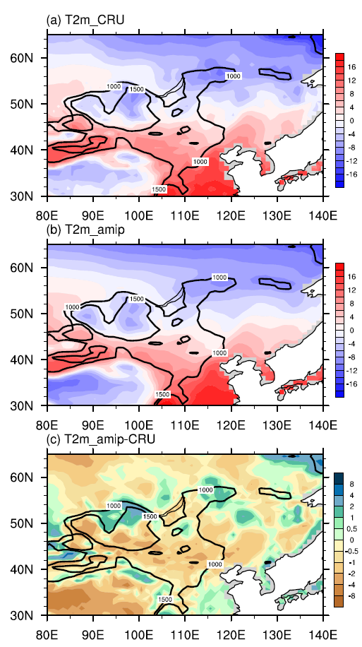 图3. 两米气温的气候平均值(单位:℃)。(a)CRU TS 数据集,(b)amip,(c)amip与 CRU TS的差值(黑色等值线表示地形高度(单位:m))。