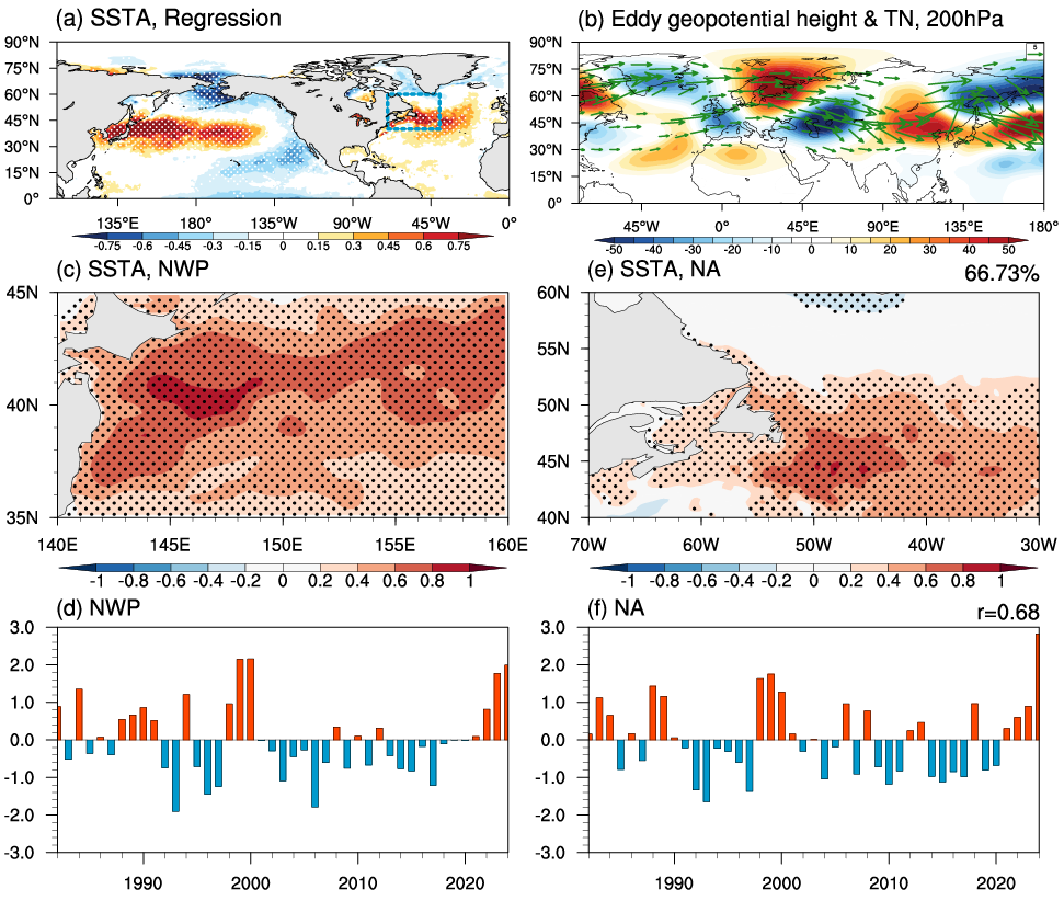 图二、(a) 北半球海温异常(填色)对黑潮延伸体区域平均海温异常的回归(1982–2024年暖季)。蓝框为本研究分析的北大西洋区域。 (b) 2024年暖季期间200 hPa涡动位势高度异常(填色)及对应的波活动通量(矢量)。 (c, e) 去趋势后西北太平洋和北大西洋海温异常的第一模态SVD耦合空间型。虚线区域表示在95%置信水平上显著。 (d, f) 分别对应(c)和(e)的SVD标准化时间序列。