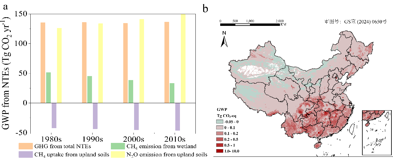 1 中国自然生态系统非CO2GWP(a) 年代变化特征;(b) 累积空间分布特征