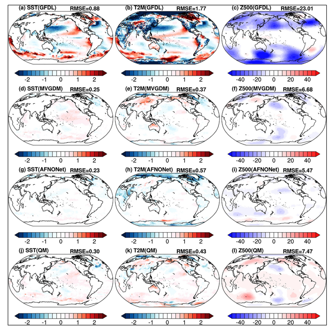图1. 不同模型(GFDL、MVGDM、AFNONet、QM)海表温度(SST)、2米气温(T2M)及500百帕位势高度(Z500)的气候平均态偏差展示于子图(a–l)中:(a–c)为GFDL结果,(d–f)为MVGDM结果,(g–i)为AFNONet结果,(j–l)为QM结果。