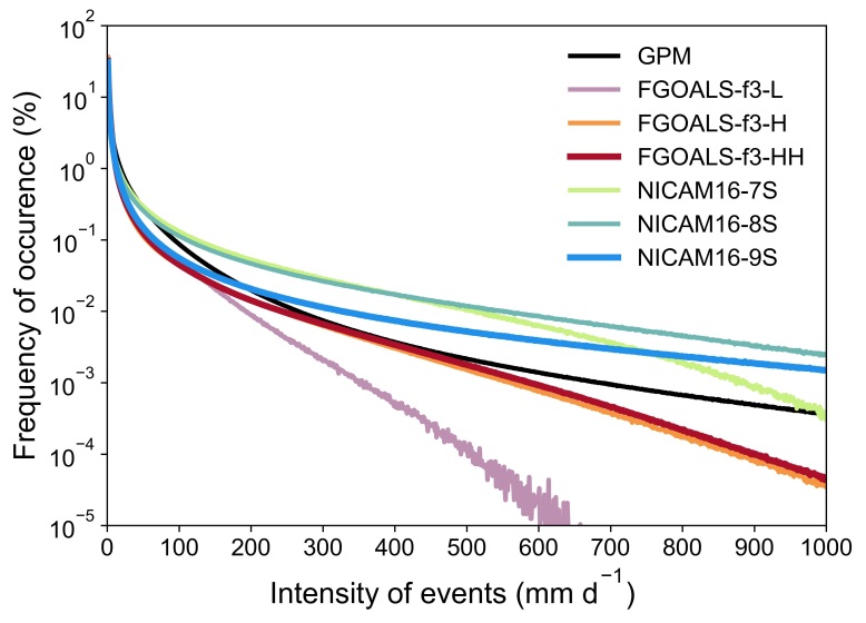 研究显示,西太平洋暖池区的降水模拟对分辨率的提高最为敏感,分辨率提高总体上缓解了对该区域降水模拟偏多的情况,但两模式存在差异:FGOALS-f3模式在分辨率提高到12.5 km后对区域的降水正偏差明显减小,而NICAM16模式分辨率提高到14 km后,该区域的主降水雨带被明显削弱,几乎消失。对于亚印太季风区,FGOALS-f3系列的100km版本模式(FGOALS-f3-L)严重低估了200 mm d−1以上的降水频次(图1),而分辨率提高到25 km(FGOALS-f3-H)和12.5 km(FGOALS-f3-HH)后对极端降水的概率分布有明显改进,主要表现在200~500 mm d−1强度的极端降水与观测的概率分布更为接近。而NICAM16系列模式对200 mm d−1以上的降水频次都有所高估,其分辨率提高到14 km后(NICAM16-9S),反而是降低了极端降水的模拟频次,减少了模拟偏差。
