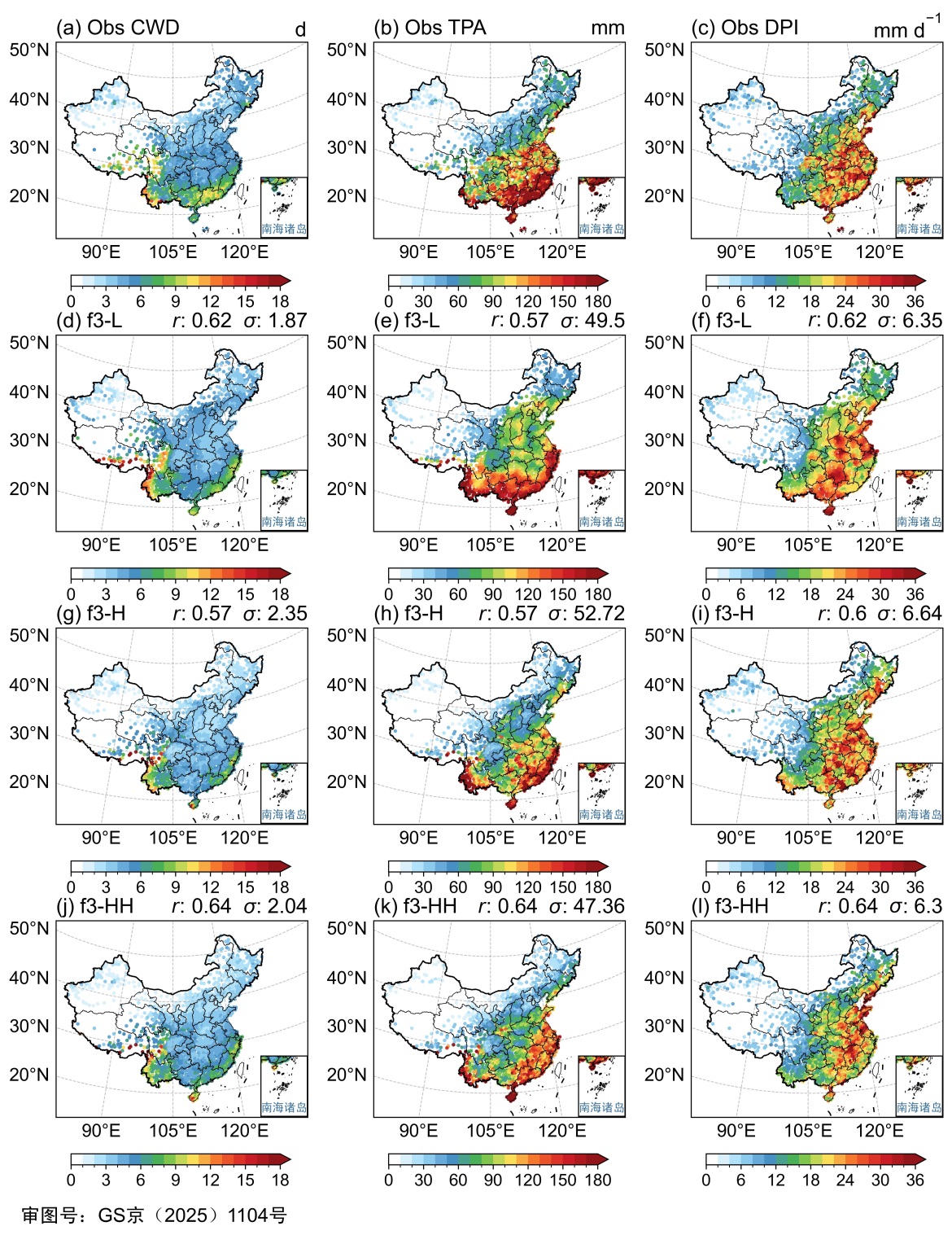 图2 观测和FGOALS模式不同分辨率模拟的中国地区极端降水指数。(a) 观测的CWD; (b) 观测的TPA; (c)观测的DPI。(d, e, f)分别与(a, b, c)相同,但为FGOALS-f3-L的模拟结果。(g, h, i)分别与(a, b, c)相同, 但为FGOALS-f3-H的模拟结果。(j, k, l)分别与(a, b, c)相同, 但为FGOALS-f3-HH的模拟结果。r为空间相关系数,σ为均方根误差。