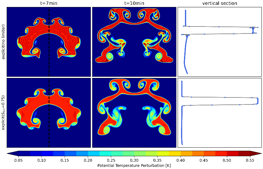 图2:Robert连续热泡实验。上方为显式方案结果,下方为使用垂直隐式求解器的结果,第1~3列为不同时刻的模拟结果。
