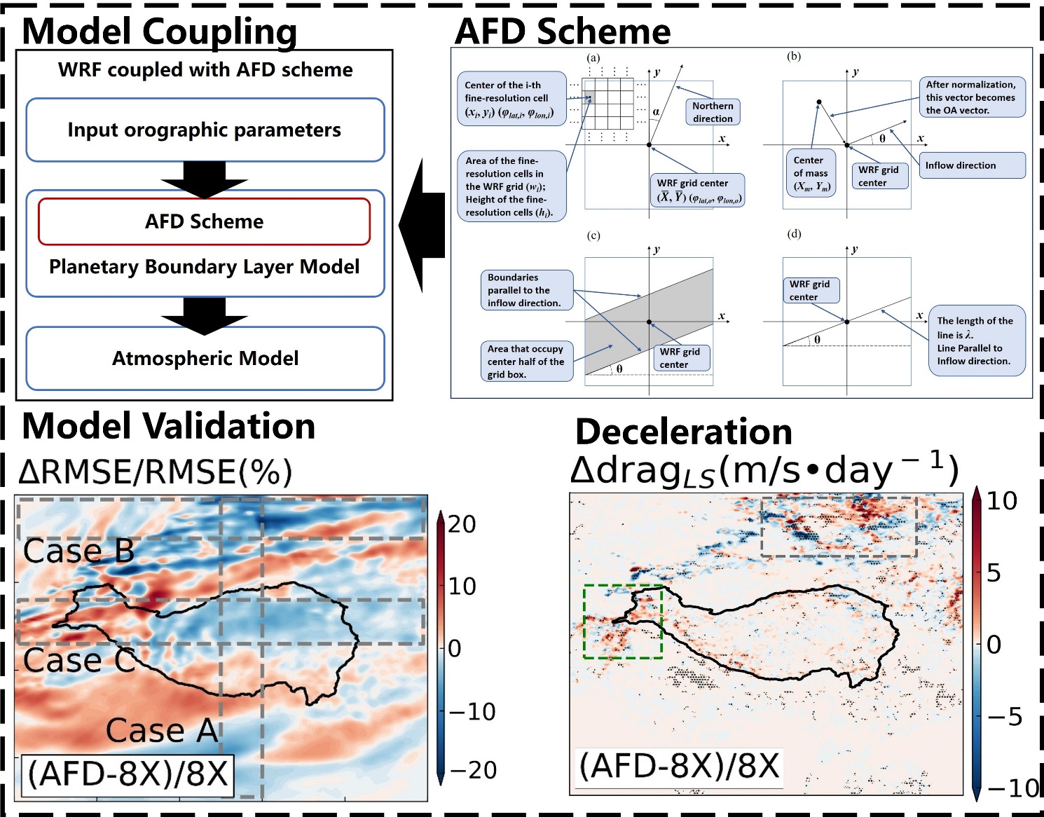 近日,中科院大气物理研究所地球系统数值模拟和应用全国重点实验室田雨航博士、谢正辉研究员及其合作者,在Weather Research and Forecast(WRF)模型中实现了考虑地形各向异性拖曳方案(AFD)的耦合与优化。该方案能够连续计算任意风向下的地形参数,克服了传统八方向方案(8X)在风向变化时出现的参数“跳跃”问题。研究团队以青藏高原及周边区域为研究对象,开展了数值模拟试验验证了新方案对模拟结果的改进并进行了机制分析。