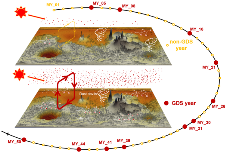 图2. 在GoMars的50年模拟中爆发的11次全球性沙尘暴,以及沙尘循环的相关机制