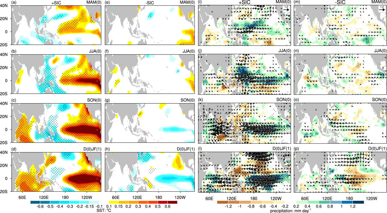 图2.北极海冰异常对ENSO事件的非对称影响。(a-d) 和 (e-h) 分别为北极关键区海冰偏高年份(左列)和偏低年份(右列)的SST合成异常季节演变。(i-p) 为对应的850hPa风场与降水合成异常。(a-h) 中打点区域表示SST异常通过95%置信度检验,(i-p) 中打点区域表示降水异常通过95%置信度检验。