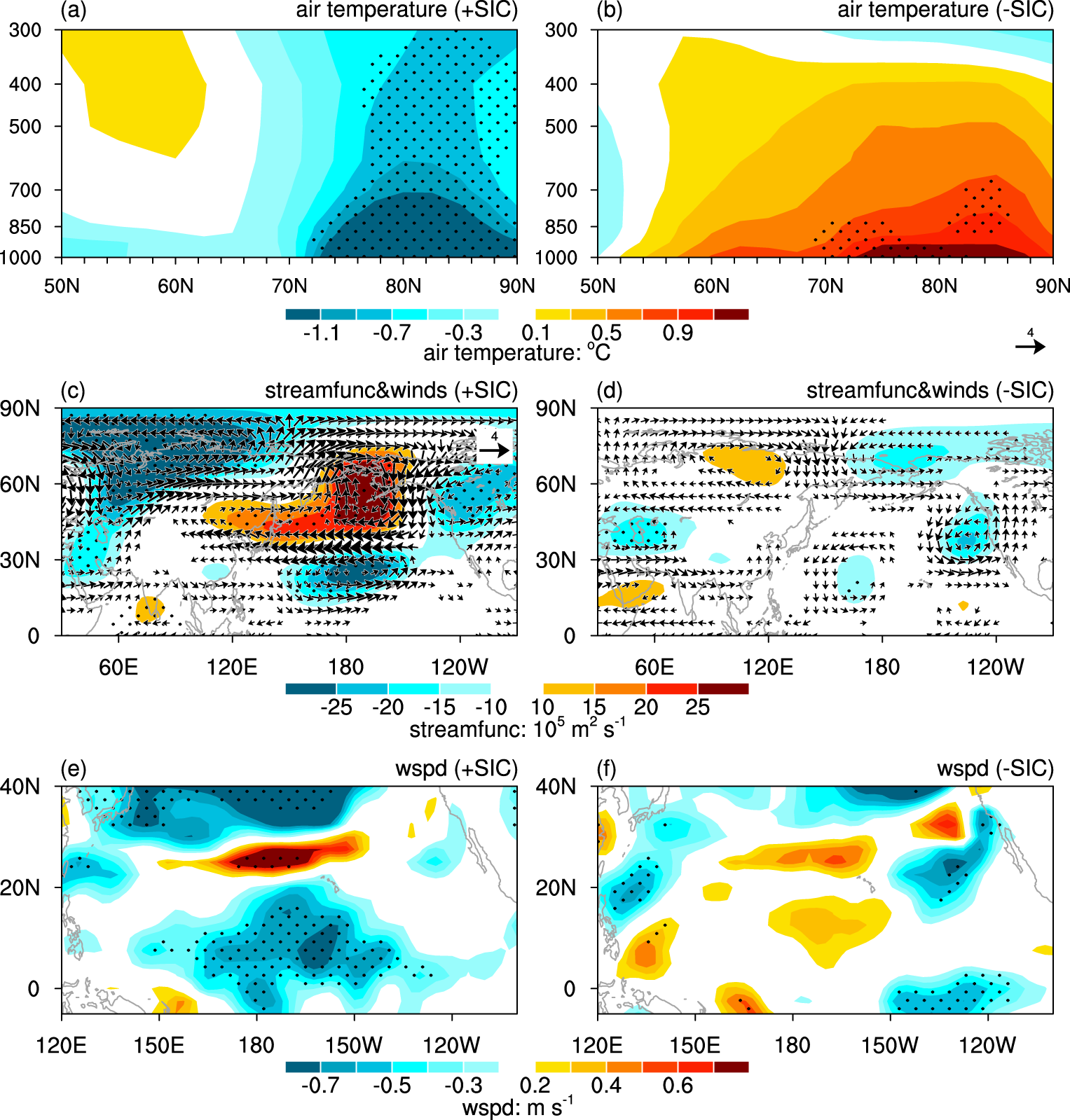 图3. 冬季北极海冰异常对同期冬季大气环流的非对称性影响。(a-b) 为北极关键区海冰偏高年份(左列)和偏低年份(右列)在0°-60°E平均的气温合成异常;(c-d) 为对应的500hPa流函数及风场合成异常;(e-f) 为表面风速异常。打点区域表示异常通过95%置信度检验。