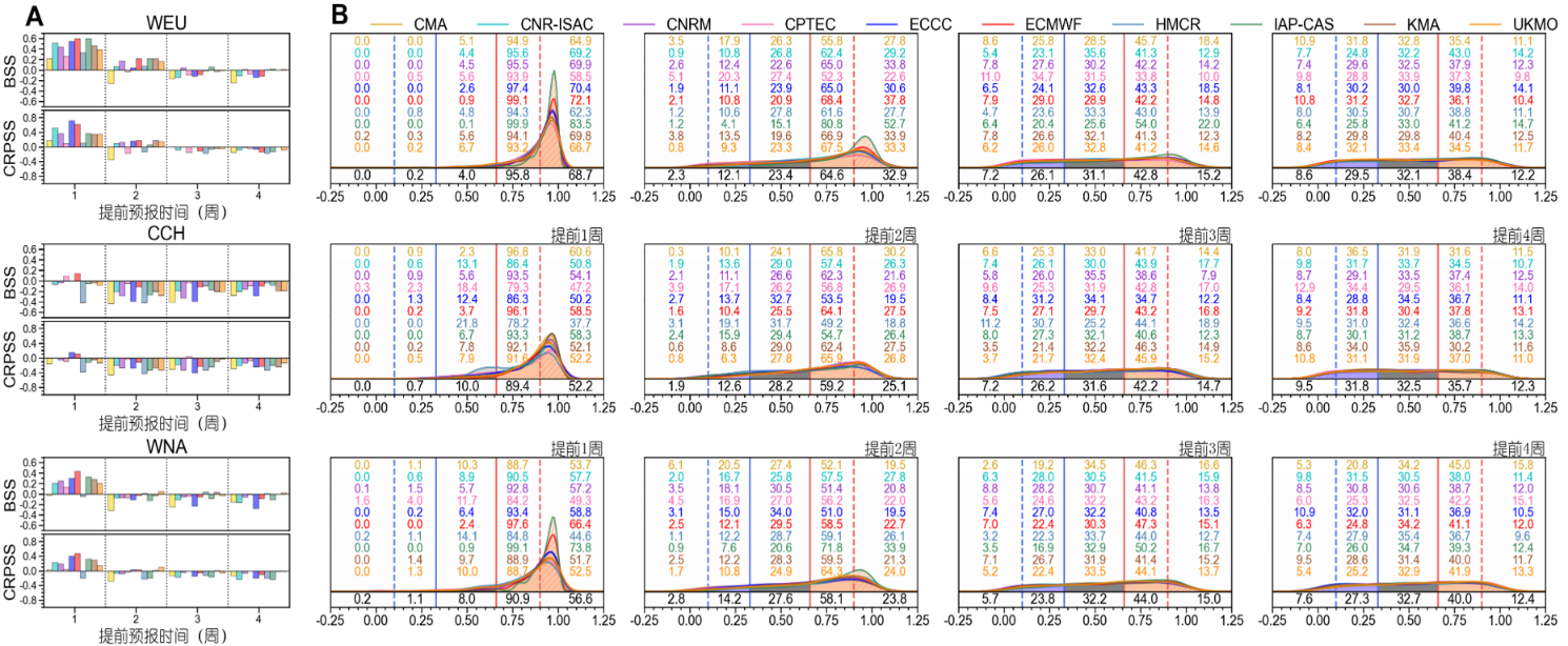 图1 S2S模式对北半球中高纬三区域热浪的提前1–4周概率预报技巧(A)预报热浪日发生的BSS和CRPSS(B)10个S2S模式对BEST观测数据集中实际发生热浪日,预测的各TX分位数对应的集合成员PDF分布,从上至下对应西欧、华中和西北美地区。不同颜色数字(%)代表不同S2S模式在该分位数区间的集合成员数占比,子图下方的黑色数字表示多模式平均的集合成员数占比