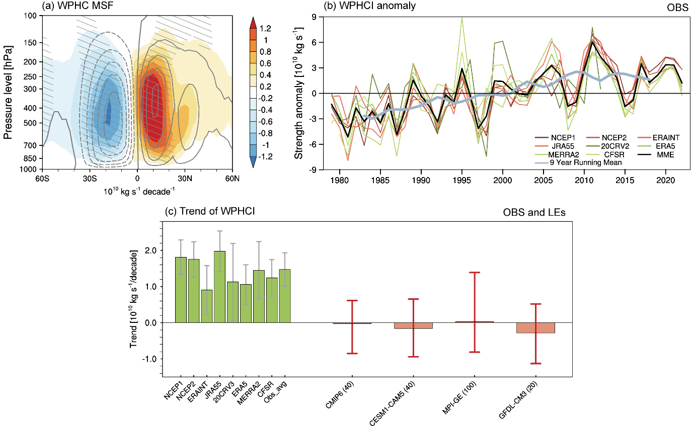 图1. (a) WPHC 质量流函数的线性趋势(阴影)及气候态(等值线)。(b) WPHC 强度指数(WPHCI)距平时间序列,灰线表示其 9 年滑动平均。 (c)观测 WPHCI 趋势(绿色柱)及其平均值;CMIP6和三个大样本模式模拟得到的趋势(橙色柱),误差线表示模式间/集合内的不确定性范围。
