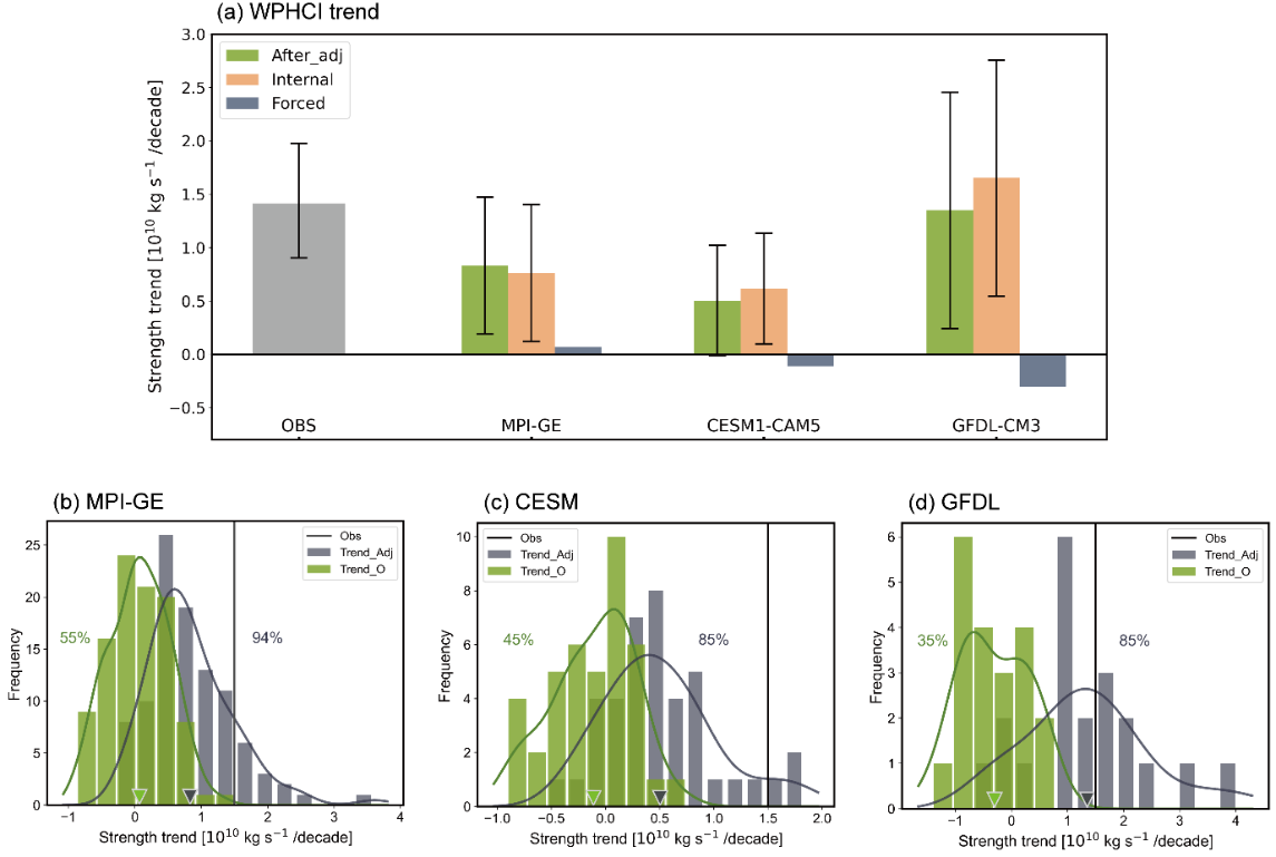 图3. (a) MPI-GE、CESM1-CAM5 和 GFDL-CM3 三套大样本模式中得到的 WPHCI 观测趋势(灰色)、调整后的趋势(Trend_Adj,绿色)、内部变率相关趋势(Trend_internal,橙色)以及外强迫趋势(Trend_F,蓝色)。(b–d) 三套大集合在调整前(绿色)和调整后(灰色)得到的 WPHCI 趋势的直方图及其拟合分布。