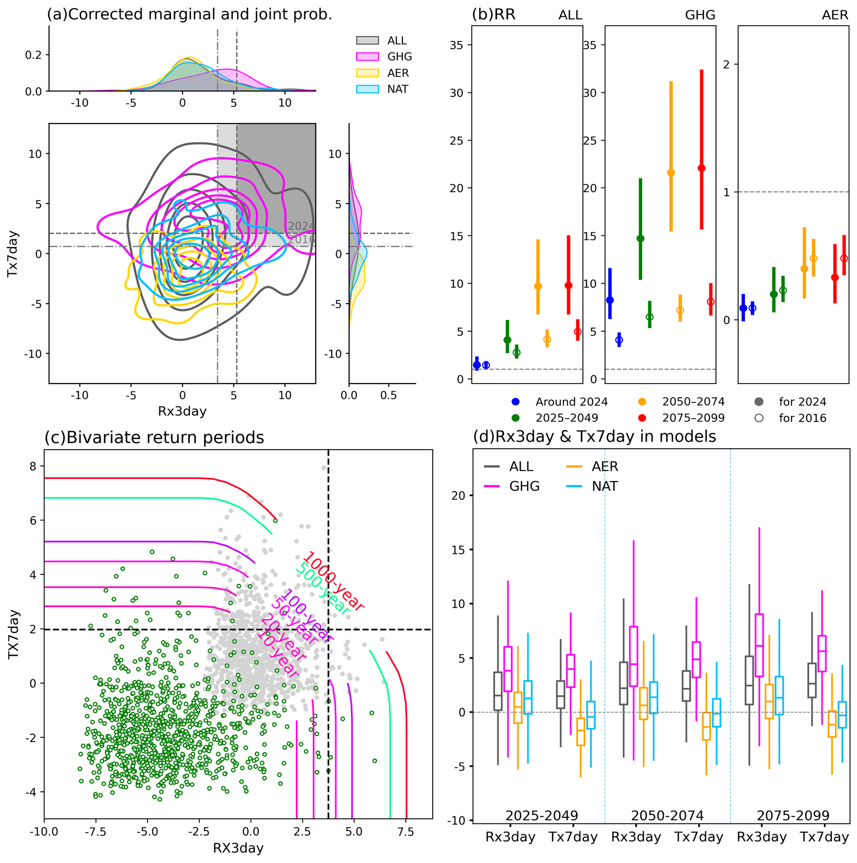 图二、(a)2022–2026年SSP2–4.5情景下,CMIP6模型(全强迫、温室气体强迫、自然强迫和气溶胶强迫)归一化校订后的三日极端降水指数(Rx3day)与七日极端高温指数(Tx7day)的边际和联合概率分布。虚线和点线分别表示2024年和2016年的阈值。(b)基于2024年(左)和2016年(右)阈值,全强迫、温室气体强迫及气溶胶强迫下复合洪水相对自然强迫的发生概率比。圆点与误差线分别表示平均值及5%–95%置信区间。(c)复合事件的双变量重现期(单位:毫米/天和摄氏度),全强迫(等值线与灰色散点)与自然强迫(绿色散点)对比。虚线表示模式模拟的阈值。(d)CMIP6模式(全强迫、温室气体强迫、自然强迫和气溶胶强迫)近未来(2025–2049年)、本世纪中期(2050–2074年)和末期(2075–2099年)归一化校订后的极端降水和高温四分位箱线图,误差线为集合成员的5%–95%置信区间。