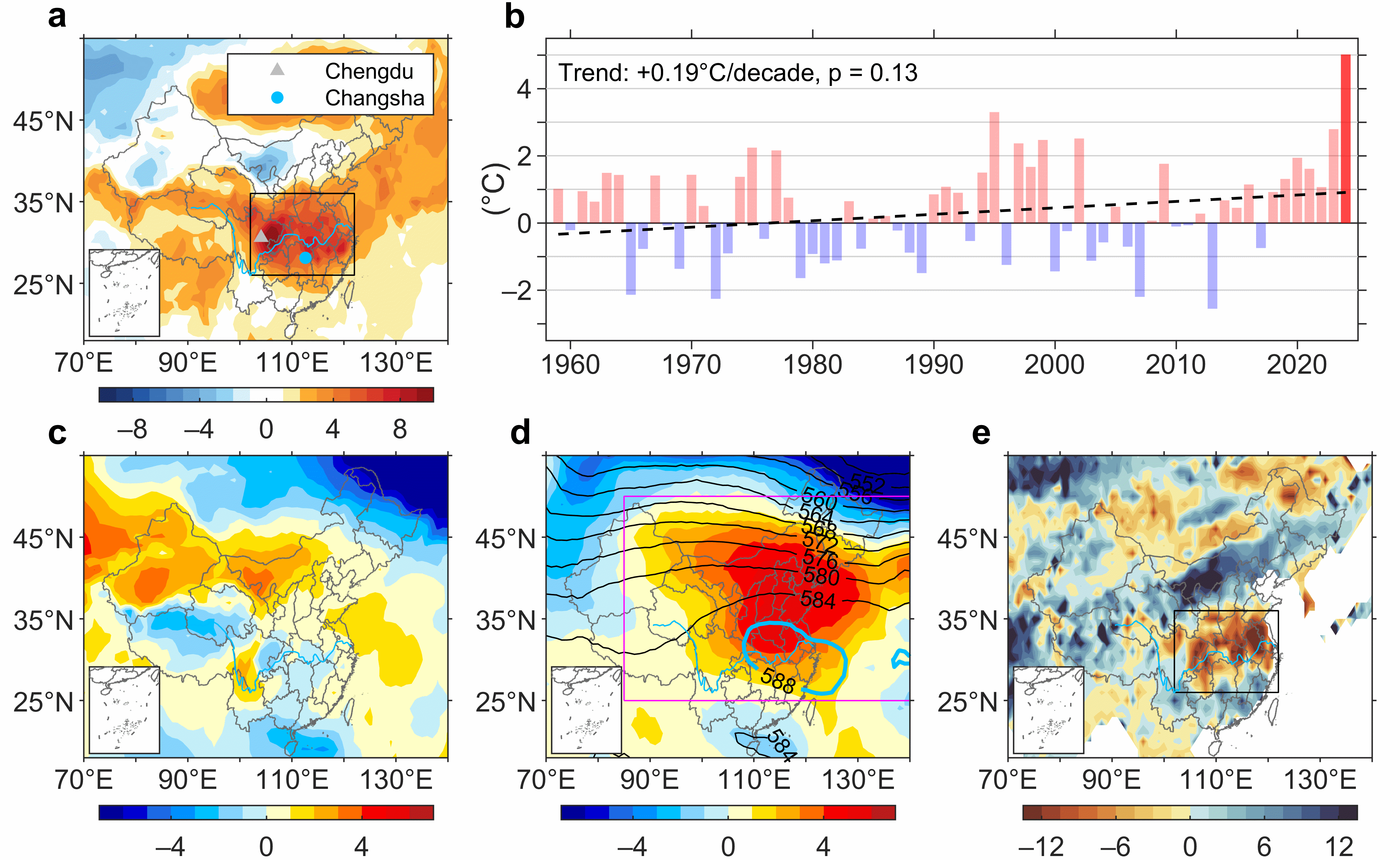 图1. 2024年9月1-10日长江中下游地区秋季破纪录热浪事件的特征和相应的环流形势:a.日最高温距平;b.区域平均的日最高气温距平序列;c.海平面气压距平;d.500百帕位势高度距平;e.土壤湿度距平