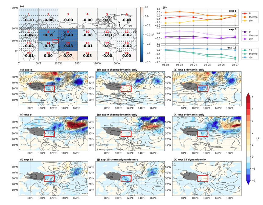 图1.24个分区敏感性试验的区域划分,以及相邻区域在事件发生后0–5天内对2022年华南极端高温事件(SCH22)的影响。(a) 区域划分(红色数字表示区域编号)及其对华南地区(红框)平均 950 hPa 温度异常的区域影响(RI,黑色数字,单位:°C)。打点区域表示通过 95% 置信水平检验。(b) 区域条件敏感性试验、仅动力试验和仅热力试验中 RI(单位:°C)的时间演变。(c–k) 与 (b) 对应的空间分布图,表示 各区域及其热动力分量对 950 hPa 温度异常(阴影)和 200 hPa 位势高度异常(等值线)的影响。