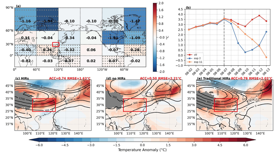 图2. 遥相关区域在 第6–11 天对SCH22事件的影响,以及基于高影响区(HIRs)/非高影响区驱动的预报结果。(a) 不同区域实验的区域影响;(b) 8 月 2 日至 13 日华南地区的逐日温度异常:控制试验(红线)、移除第 2 区域异常后的试验(蓝线)以及移除第 11 区域异常后的试验(橙线)。(c) 仅保留高影响区(HIRs)异常驱动的预报实验结果(范围约全球面积25%),包括邻近区域 8、9、14 和 15,以及遥相关区域 1、2、6、11 和 12;(d) 仅保留其余区域异常驱动的预报结果;(e) 由传统合成分析识别得到的高影响区驱动的预报结果(范围约为整个北半球)。