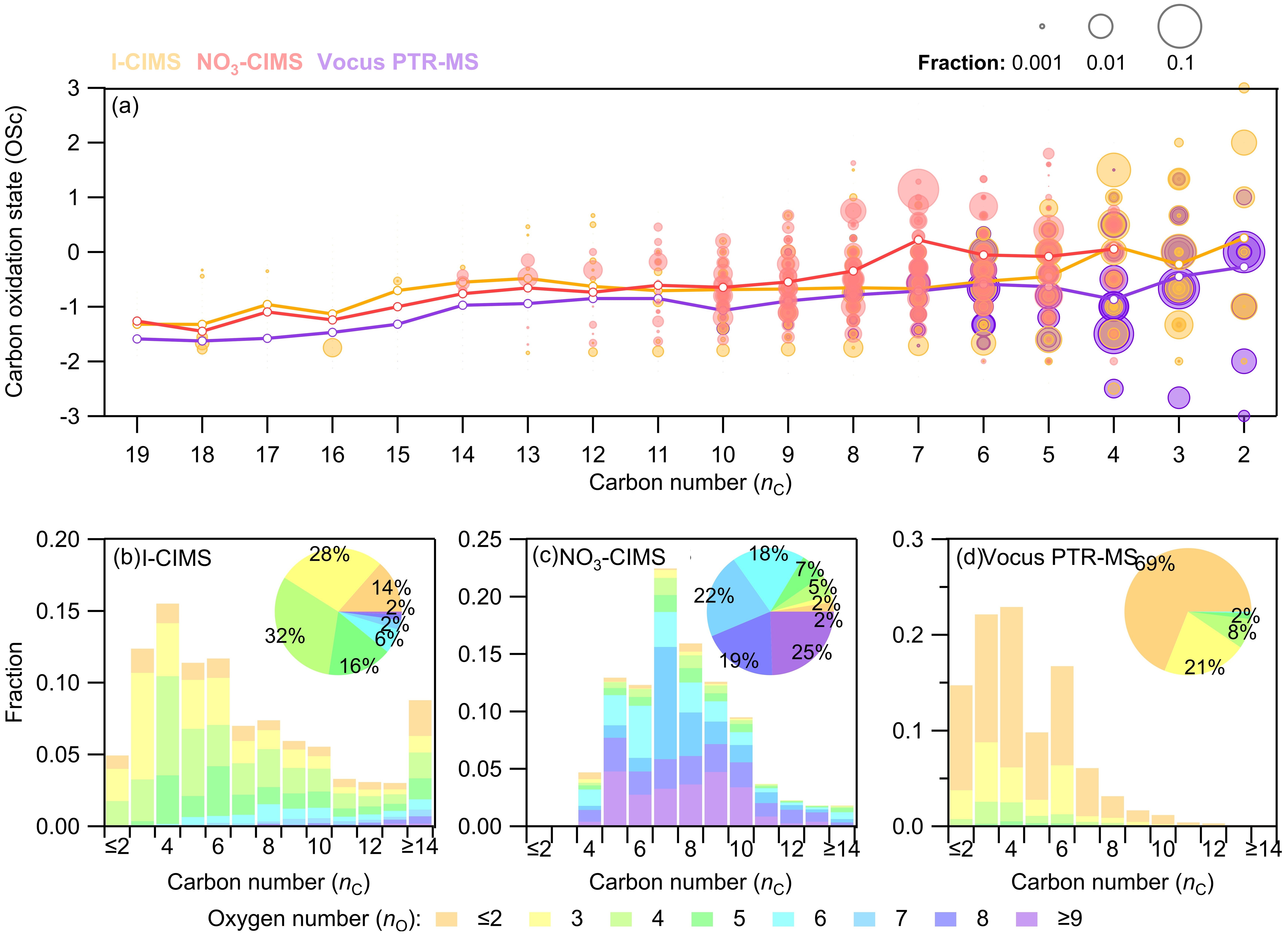 图1. 观测期间所测OOMs的(a)碳氧化态(OSC)与碳数的关系以及(b-d)不同碳数和氧数下浓度占比的分布。
