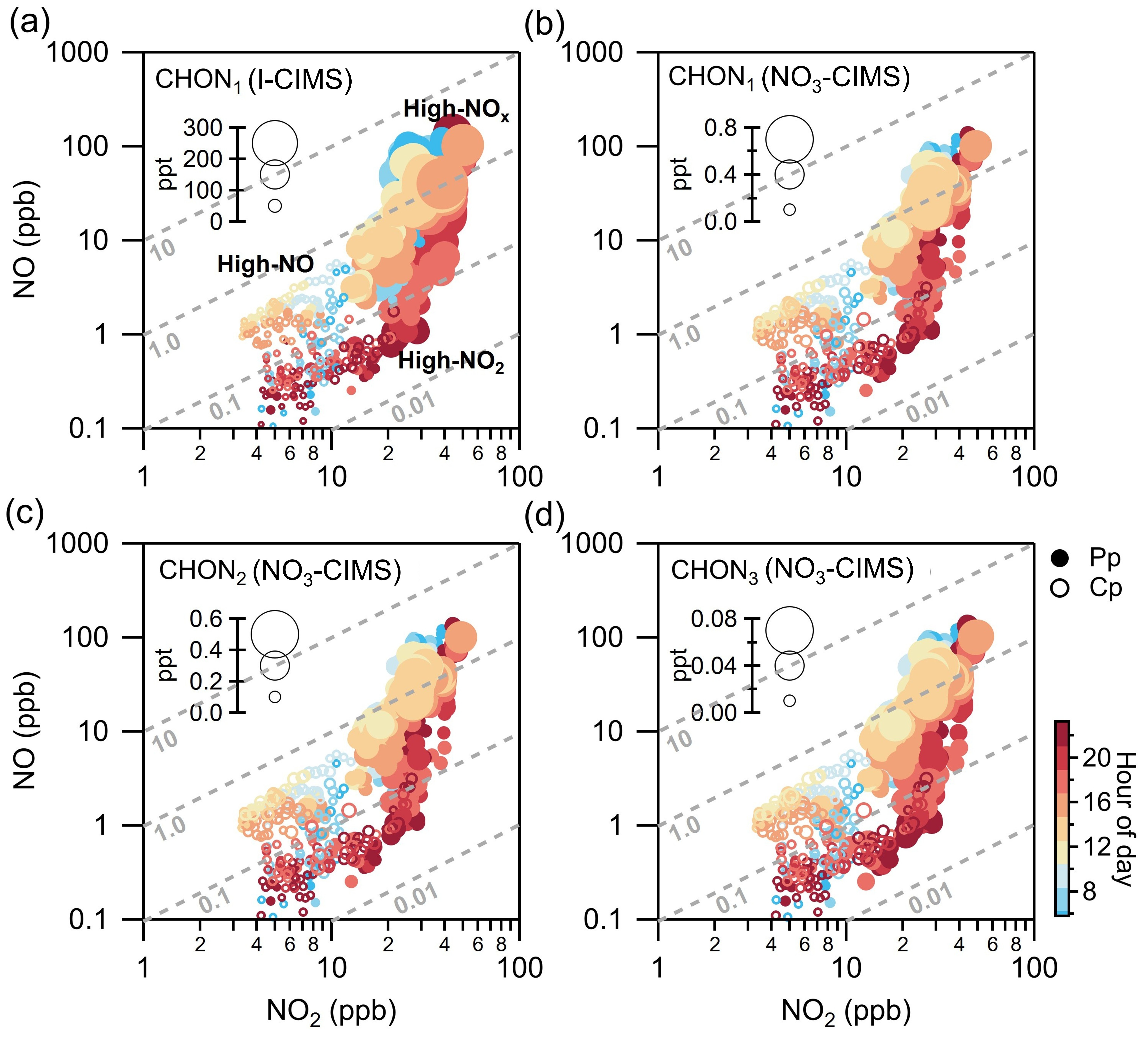 图2. 污染时段(Pp)与清洁时段(Cp)NO与NO2的浓度关系,按(a) I-CIMS 和 (b-d) NO3-CIMS所测的不同CHON类OOMs分图展示。