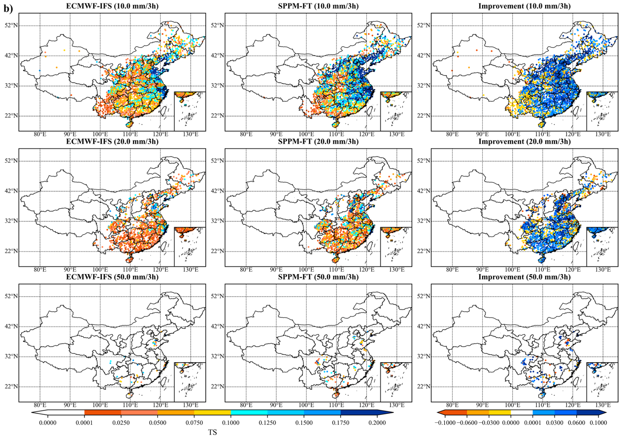 图1. 10.0 – 50.0 mm/h阈值下,ECMWF-IFS(左一列)、SPPM-FT(左二列)的TS评分空间分布对比,以及SPPM-FT的改进幅度(右一列)