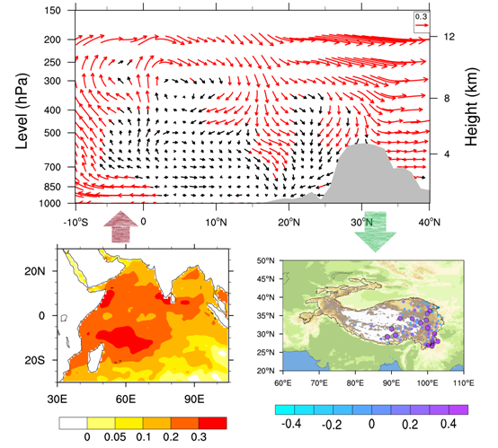 考虑到亚洲季风爆发的不同阶段背景环流差别很大,以往从季节平均出发讨论这一问题很可能会模糊掉一些重要信息。因此,大气所段安民研究员和博士生赵宇选择从月平均尺度上考察与高原热源紧密相关的海洋遥强迫信号,发现不同于2-4月的情形,随着从冬到夏西风带的北撤,孟加拉湾夏季风的爆发使得背景环流发生转向,5月高原地面热源的强度主要受到IOBM信号的影响。