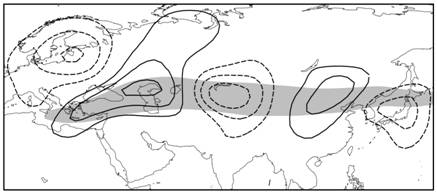 图1. 丝绸之路遥相关型(等值线). 阴影表示亚洲急流.